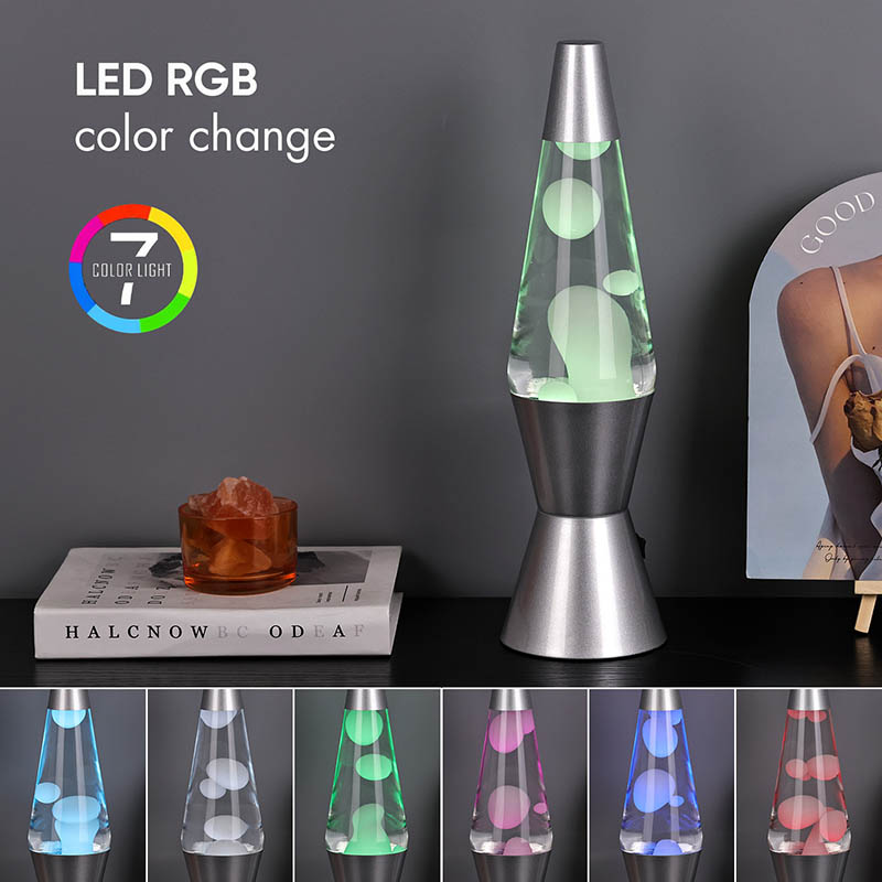 La lámpara de lava LED RGB de 15 pulgadas tiene 7 colores que cambian en la parte inferior. El color es blanco con la lava.