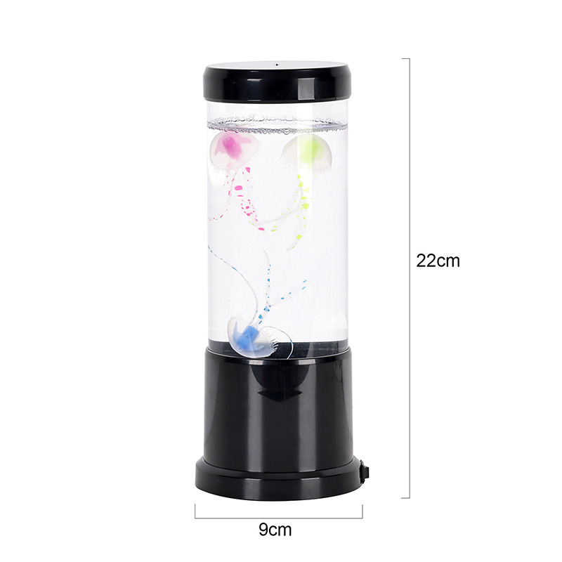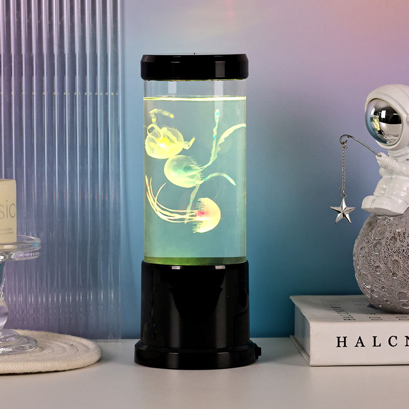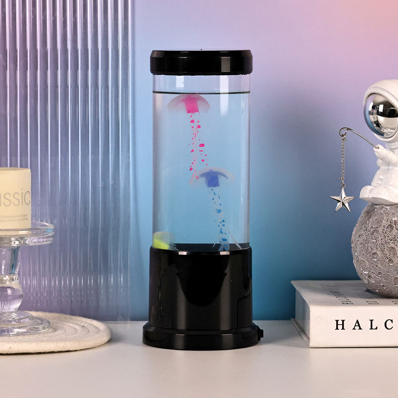 La lámpara presenta una lámpara de medusa realista en color negro que flota suavemente dentro de un tanque cilíndrico transparente, creando un ambiente relajante bajo el agua que transforma cualquier habitación en un sereno refugio oceánico.