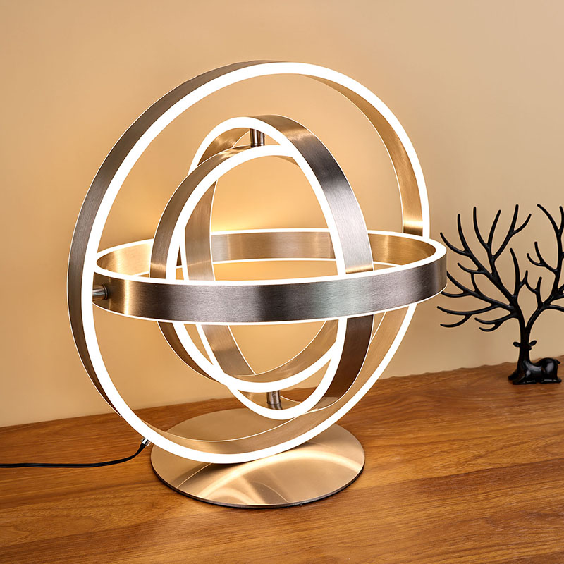 Fabricada con precisión, la lámpara de mesa decorativa LED de anillos múltiples presenta un diseño elegante y elegante fabricado con materiales de aleación duraderos. La lámpara se compone de múltiples anillos entrelazados que crean una apariencia única y visualmente impactante. Ya sea que la coloques en tu escritorio, mesita de noche o cualquier otra superficie, esta lámpara seguramente cautivará y deleitará.