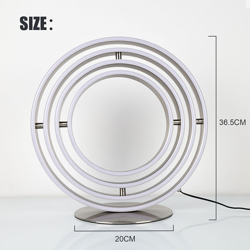 El corazón de la lámpara de mesa decorativa LED con anillos múltiples es su cautivadora pantalla. Los anillos están iluminados por luces LED brillantes que emiten un brillo cálido y acogedor. La luz se difunde a través de los anillos, creando un efecto visual fascinante que añade una capa extra de encanto a tu espacio vital. Ya sea que esté leyendo un libro, trabajando en su computadora portátil o simplemente disfrutando de una velada acogedora, esta lámpara brinda el ambiente perfecto.