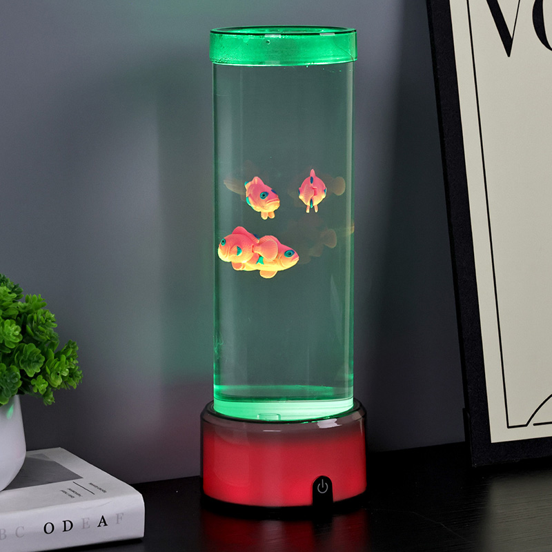Interruptor de selección táctil y natación de medusas.Lámpara de pez medusa con lámpara decorativa con base RGB, un juguete de visualización para niños de nuevo diseño con un diseño cilíndrico de retención de agua. Después de llenarlo con agua, se colocan en su interior tres peces pequeños. La lámpara Jellyfish Fish con base RGB puede nadar hacia arriba y hacia abajo cuando el pequeño motor en la parte inferior gira. Al mismo tiempo, la base tiene transformación de color RGB. Lo más destacado de este producto es que la base también cambia con la transformación del color. El diseño totalmente de plástico es muy liviano y no retiene agua, lo cual es muy conveniente para el transporte. La fuente de alimentación de la lámpara de pescado es proporcionada por USB tipo C de bajo voltaje, lo cual es muy conveniente