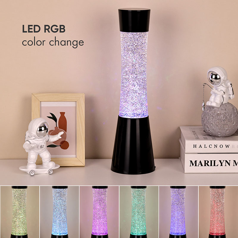 Otro punto a destacar de esta pequeña luz nocturna es su diseño interior líquido y brillante. El líquido contiene una gran cantidad de brillo, que brilla intensamente bajo la iluminación de la luz, como si innumerables estrellas titilaran en el cielo nocturno. A medida que el líquido fluye, la brillantina se dispersará de forma irregular, creando un efecto visual de ensueño. La lámpara de lava LED con purpurina con batería 3AAA también tiene función de iluminación de color RGB. A través de la avanzada tecnología LED, los accesorios de iluminación pueden emitir una luz suave y uniforme y ajustar libremente el color de la luz según las diferentes escenas y necesidades. Puede elegir su color favorito o hacer que los accesorios de iluminación cambien de color automáticamente para crear un espectáculo visual colorido.