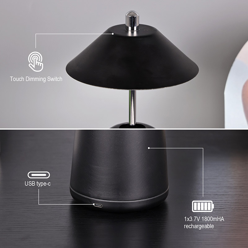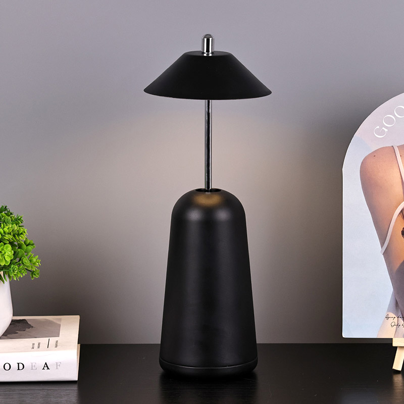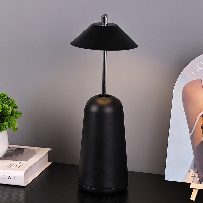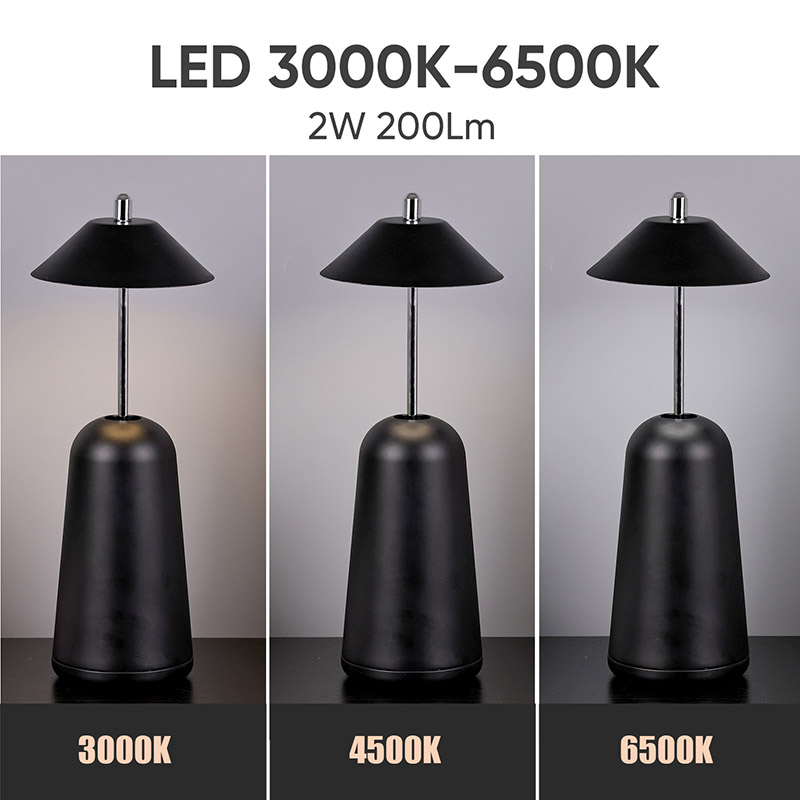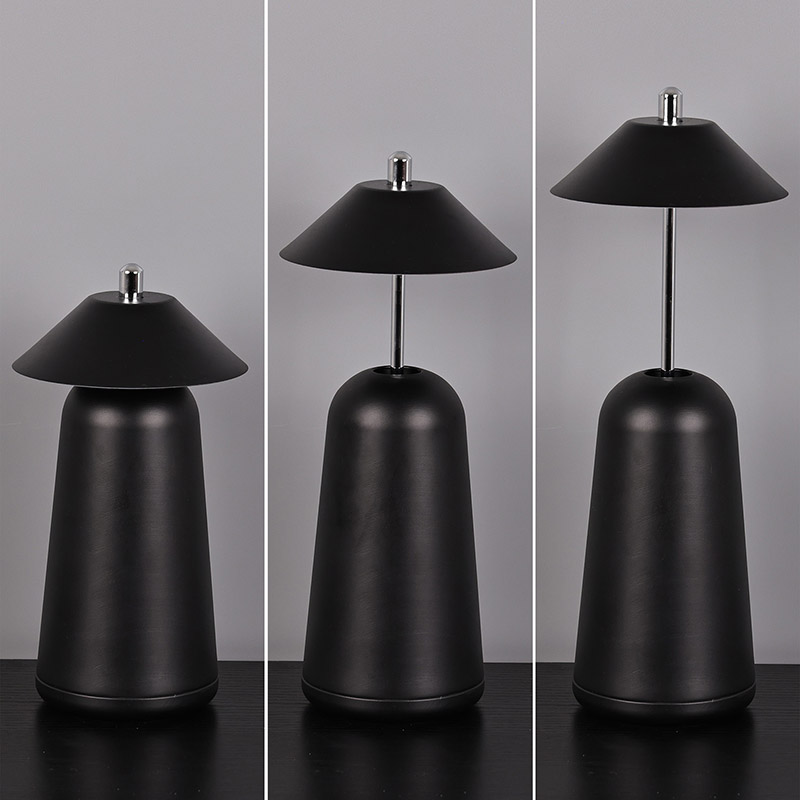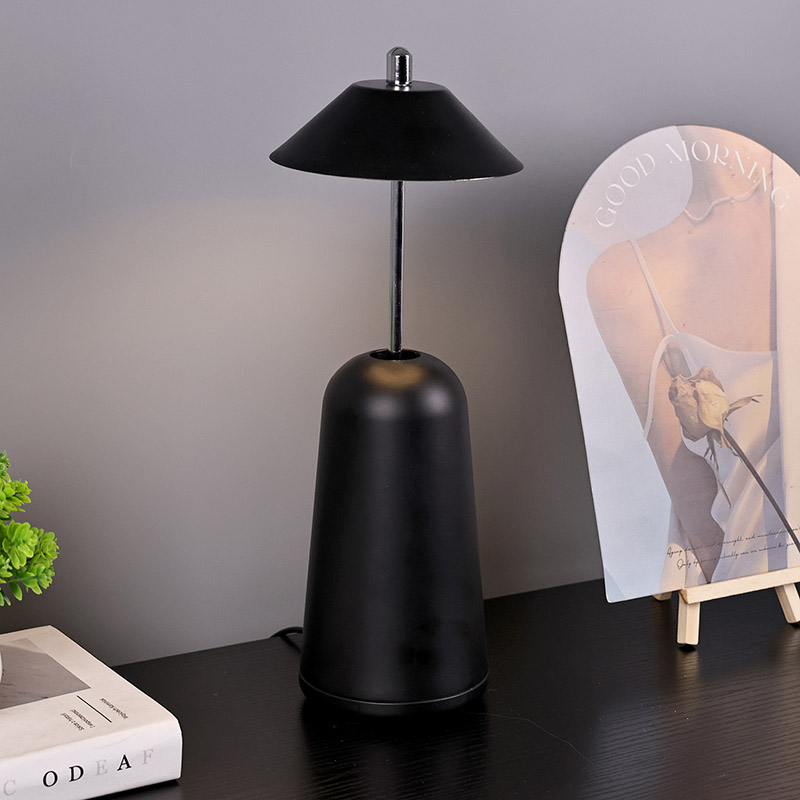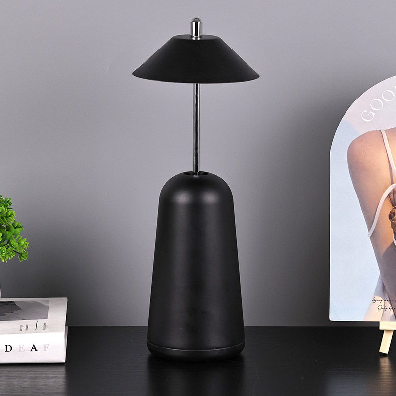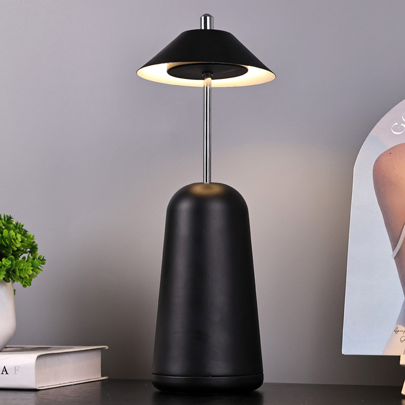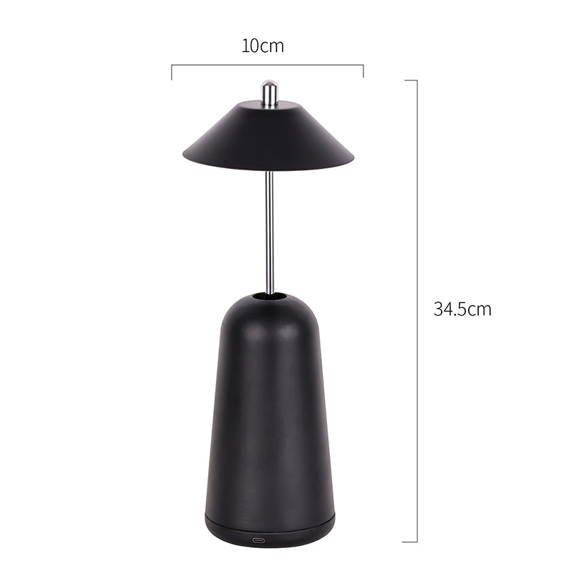 La luz de la lámpara de escritorio LED moderna con pantalla ajustable de altura se corta internamente en la pantalla, con colores cálidos y tres niveles de intensidad de luz que van desde 3000K a 6500K. La parte superior de la pantalla es un interruptor táctil, similar a una antena. La base está compuesta de metal cilíndrico irregular.