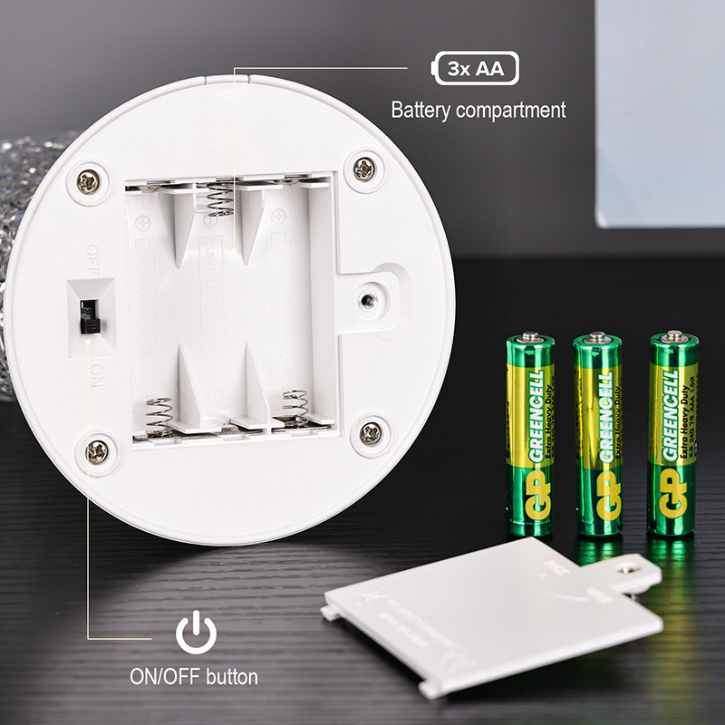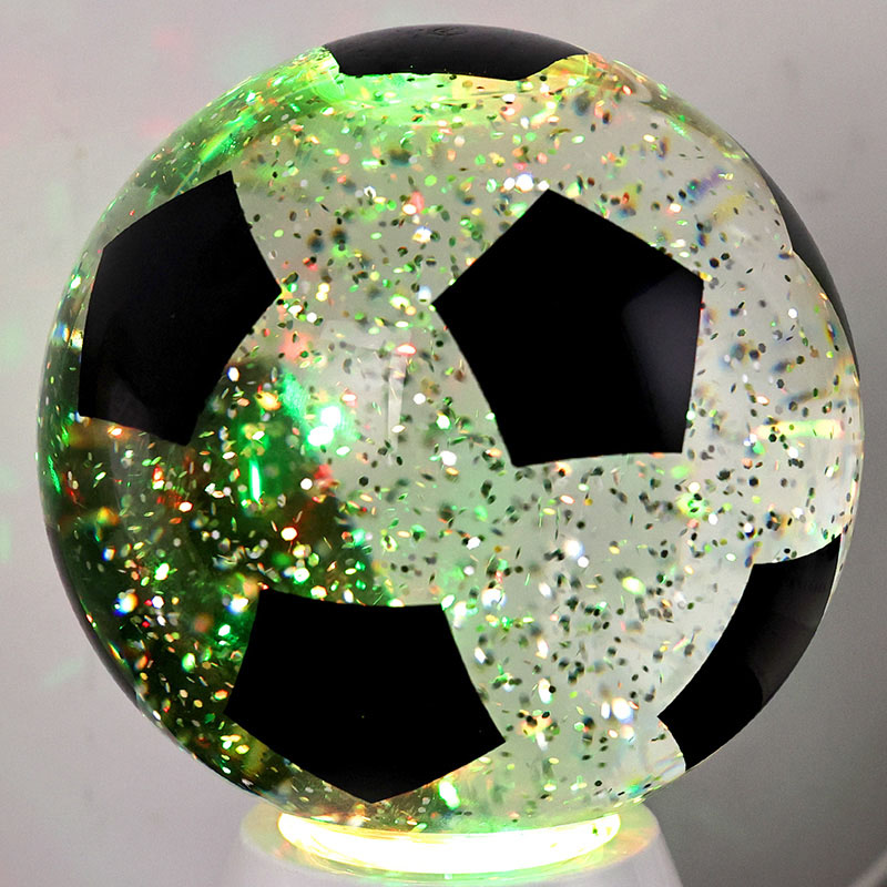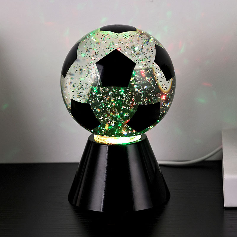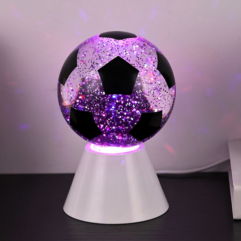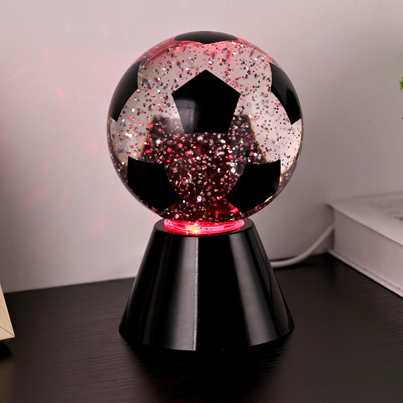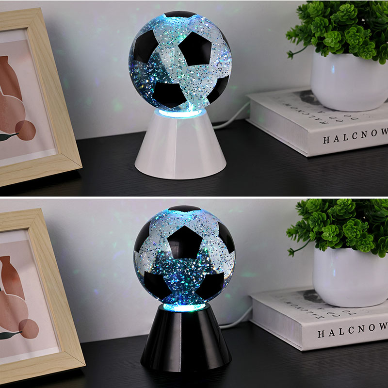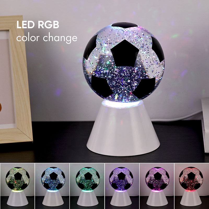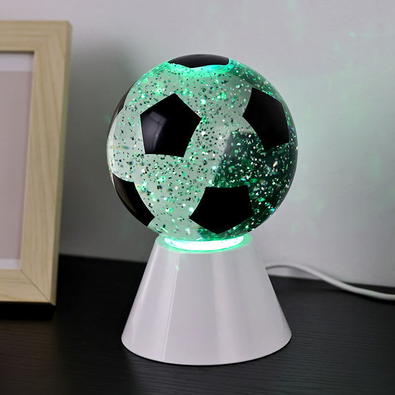 Blanco + cambio de color LEDLa lámpara de regalo esférica se compone de una parte superior de cristal y una base de plástico. La superficie del vidrio está impresa con motivos de fútbol, que se pueden imprimir en varios colores. La característica principal de Night Light with Football Shade es que hay líquido dentro de la esfera, que contiene lentejuelas. Después de encender el interruptor, el pequeño motor incorporado comienza a funcionar y el líquido dentro del vaso se moverá irregularmente. Al mismo tiempo, la luz inferior de Night Light with Football Shade comienza a cambiar, lo cual es muy hermoso. La luz nocturna con pantalla de fútbol se utiliza principalmente para la decoración de interiores, en habitaciones, salas de estar, habitaciones de hotel y otros lugares. El producto también viene con carga USB y puede usar baterías 3AAA.