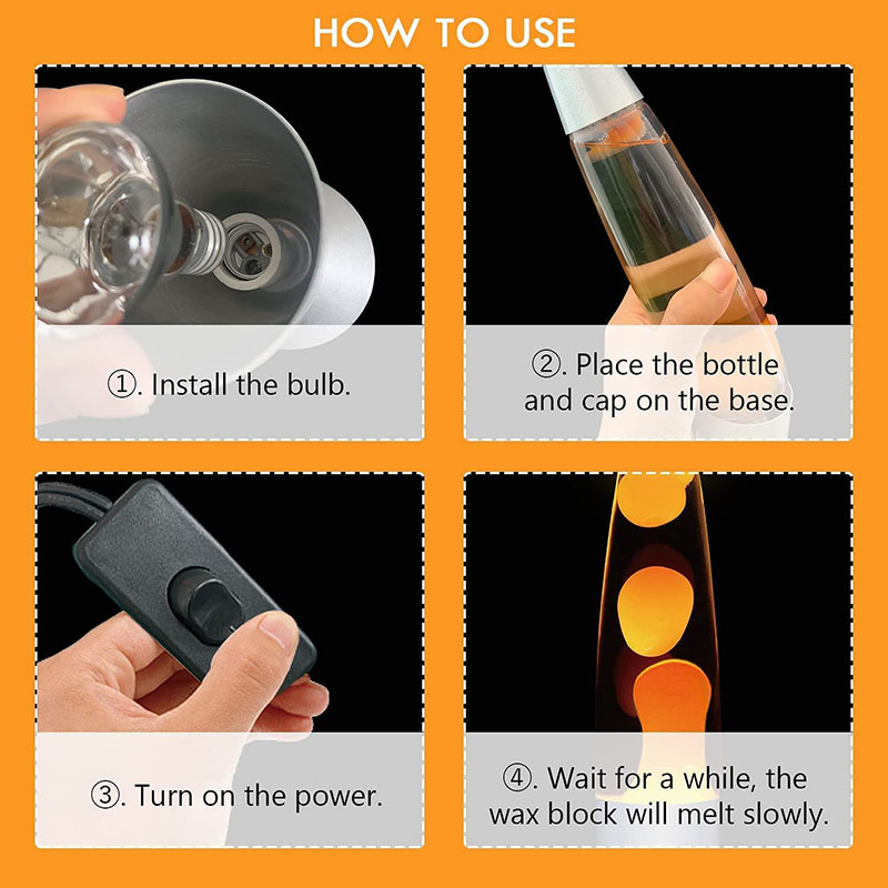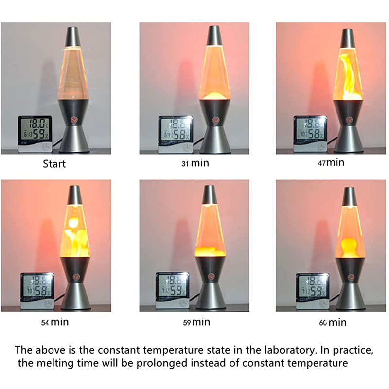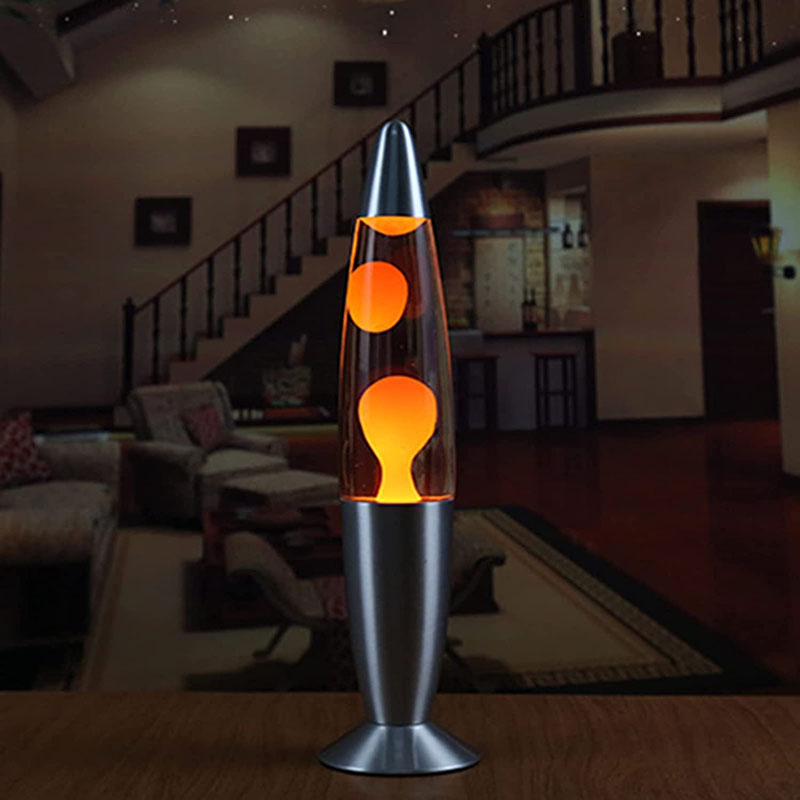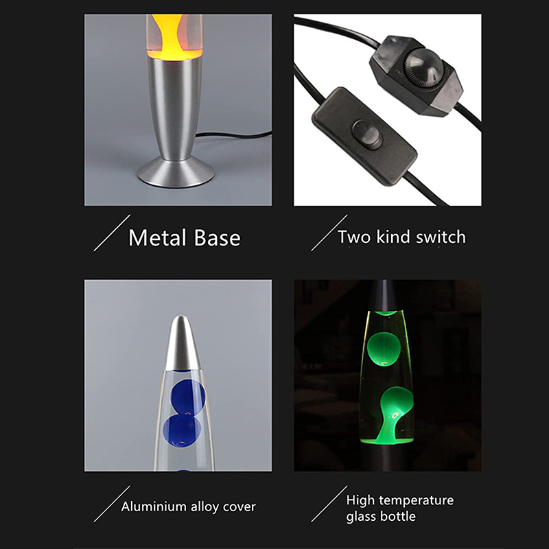 Base plateada y botella transparente, cera y líquido de diferentes colores. |