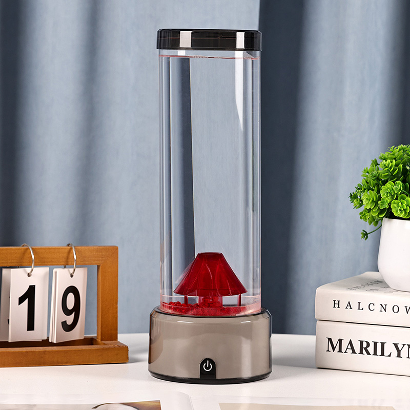 En el corazón de la lámpara se encuentra un modelo de volcán en miniatura, intrincadamente diseñado para parecerse a un cono volcánico real. Cuando se enciende, el volcán comienza a “hacer erupción”, enviando partículas de color rojo hacia arriba a través de la columna de líquido en un movimiento rítmico continuo. Estas partículas, suspendidas en un líquido no tóxico especialmente formulado, suben y bajan como burbujas de lava, creando un efecto hipnótico que recuerda a un volcán activo. El movimiento es impulsado por un pequeño sistema de bomba interna, que hace circular el líquido de manera suave pero constante, lo que garantiza un rendimiento duradero sin sobrecalentamiento.