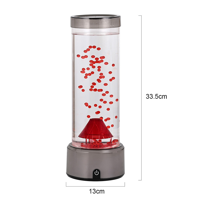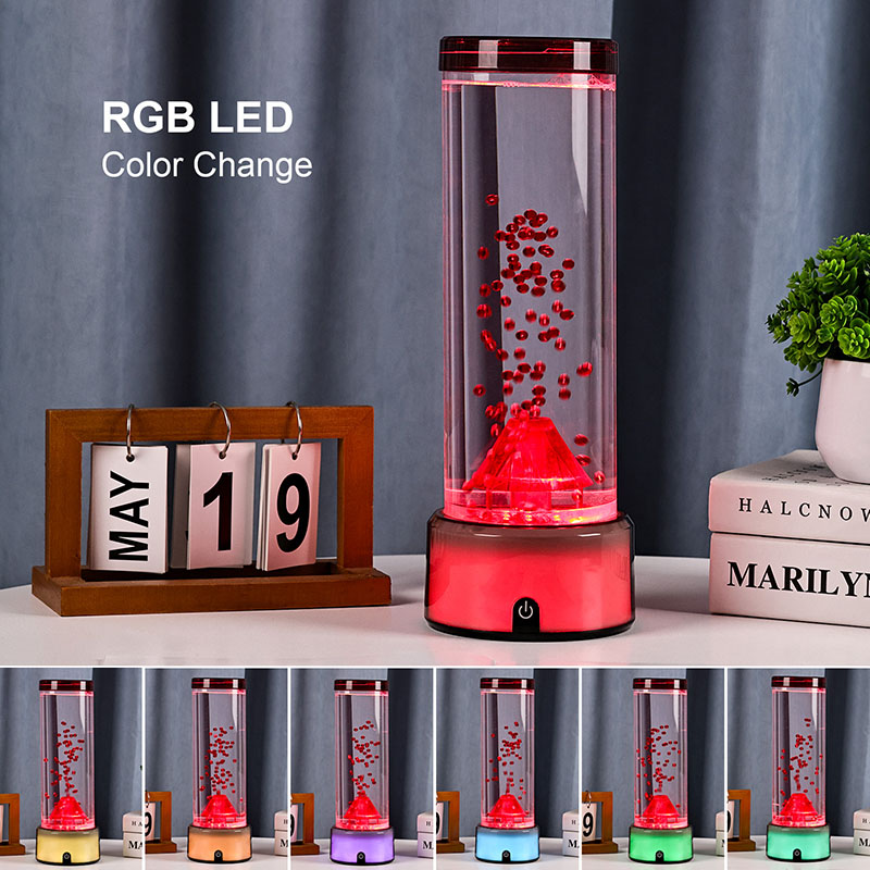 Diseñada con meticulosa atención al detalle, esta lámpara LED con forma de volcán presenta una cámara de líquido cilíndrica llena de un fluido transparente y partículas rojas flotantes que simulan una erupción volcánica cuando se activa. La base de la lámpara brilla con luces RGB vibrantes que cambian de color, mientras que la estructura central del volcán pulsa con una iluminación ardiente, imitando una erupción real. Al mismo tiempo, delicadas decoraciones parecidas a medusas flotan con gracia dentro de la columna de líquido, añadiendo un ambiente submarino surrealista. Juntos, estos elementos crean un espectáculo visual fascinante que combina el poder de la naturaleza con la elegancia del diseño moderno. Diseño y atractivo estético La lámpara Volcano que cambia de color RGB mide aproximadamente 12 pulgadas de alto, lo que la hace ideal para colocarla en escritorios, mesitas de noche, estantes o como una pieza decorativa llamativa en salas de estar, dormitorios o incluso aulas. Su silueta elegante y moderna presenta un tubo cilíndrico transparente hecho de plástico resistente a roturas de alta calidad, lo que garantiza durabilidad y seguridad. La tapa superior está sellada de forma segura para evitar fugas, mientras que la base está fabricada con plástico liso con acabado mate y un panel de control incorporado.